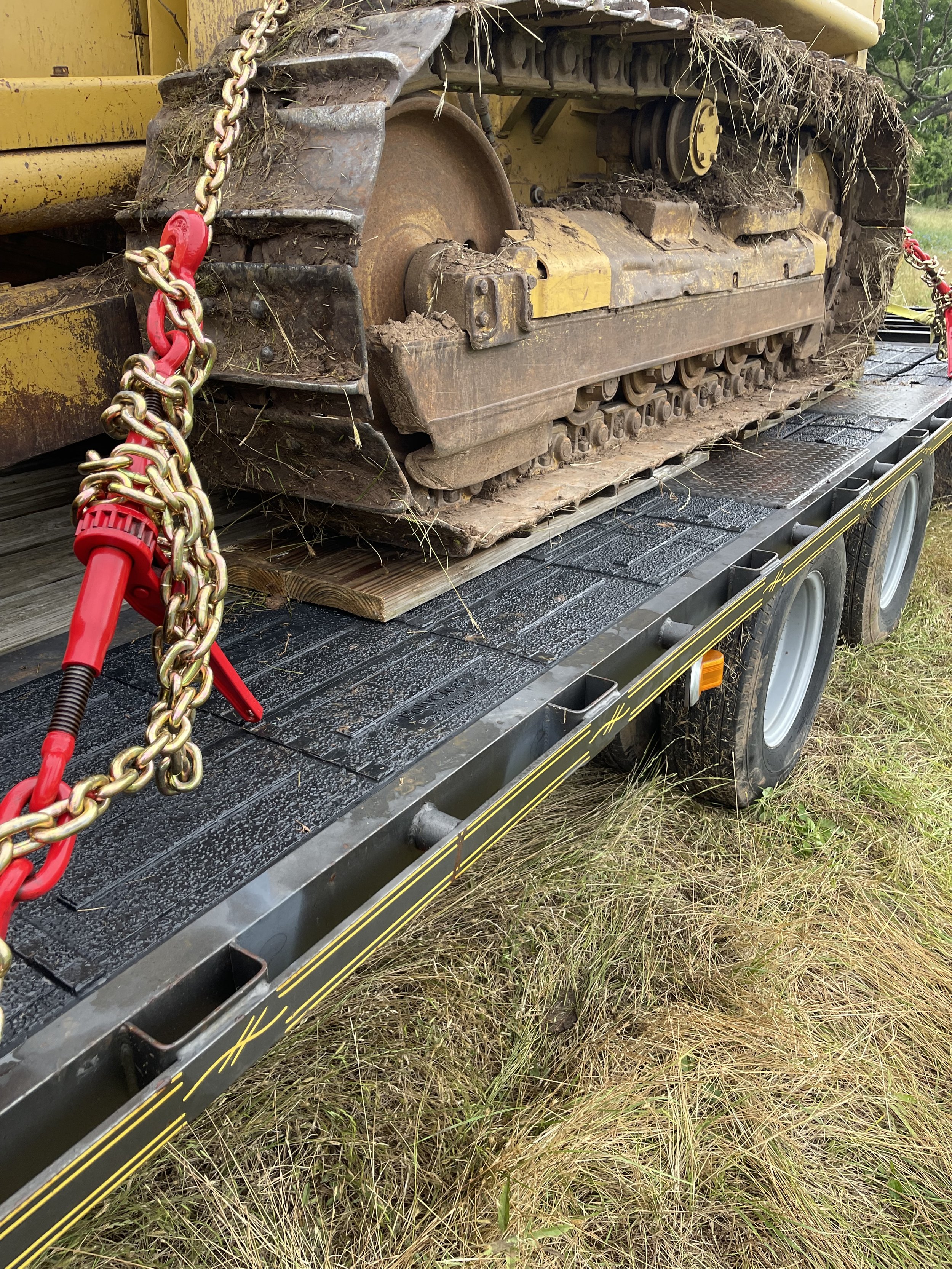 Randy B’s flatbed trailer on 1/4” cleats with a bulldozier.